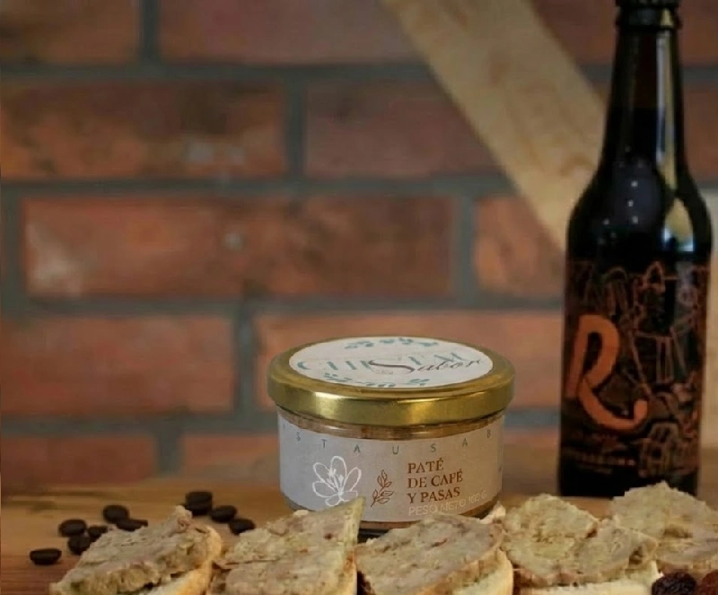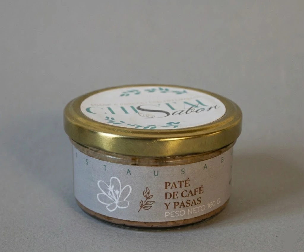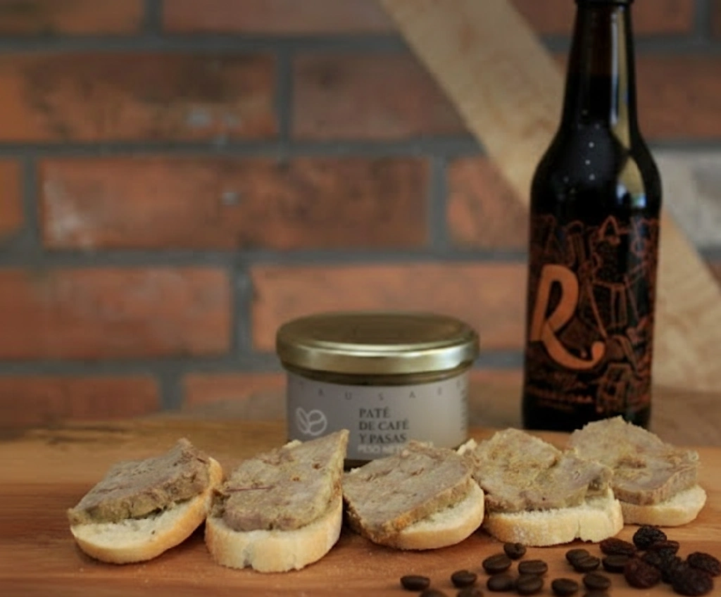 Paté de sabor suave y muy especial, diferente a cualquier paté que hayas probado antes. Con toques amargos y tostados procedentes del aroma a café que contrastan perfectamente con el dulzor de las pasas.