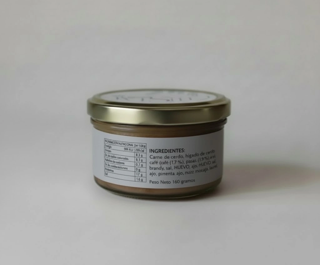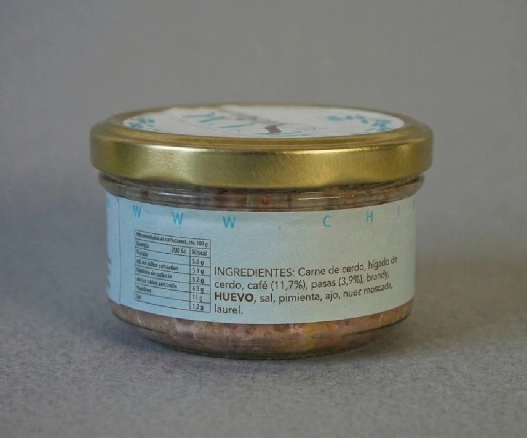 INGREDIENTES: Carne magra de cerdo, hígado de cerdo, sal, pimienta, laurel, ajo, nuez moscada, coñac, HUEVO, café (11,7%) y PASAS (3,9%).