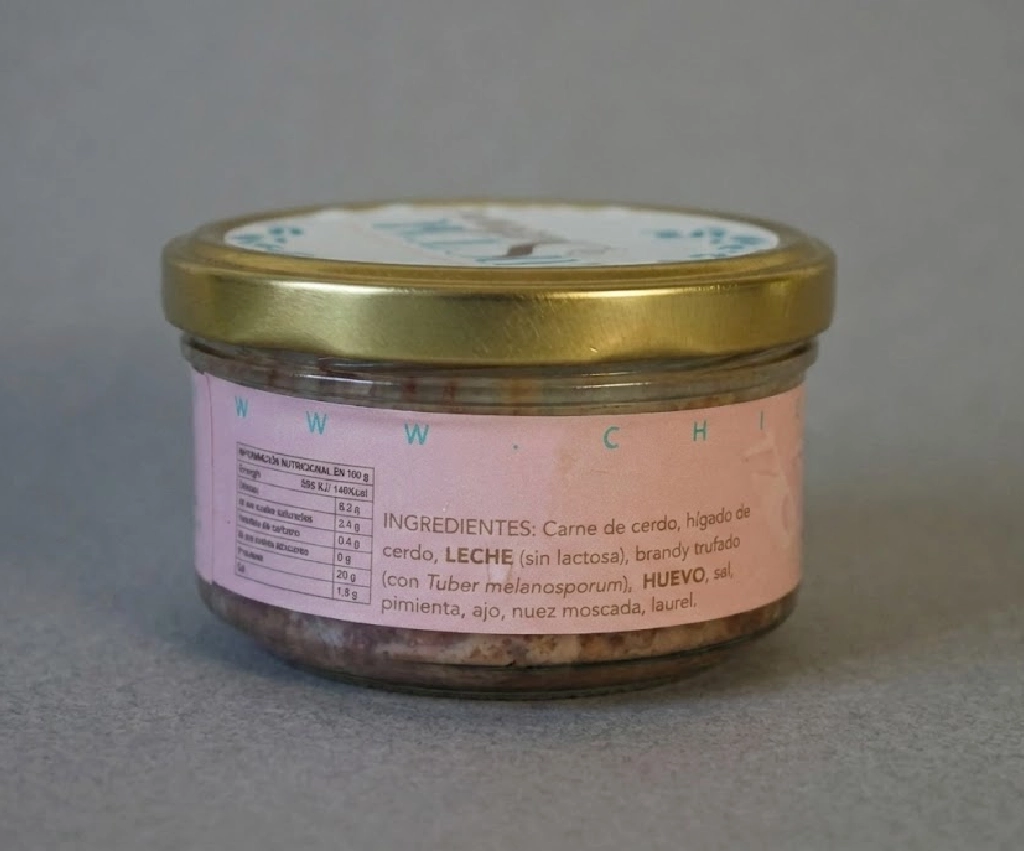 INGREDIENTES: Carne de cerdo, hígado de cerdo, sal, ajo, laurel, pimienta, nuez moscada, brandy, HUEVO, LECHE (sin lactosa).