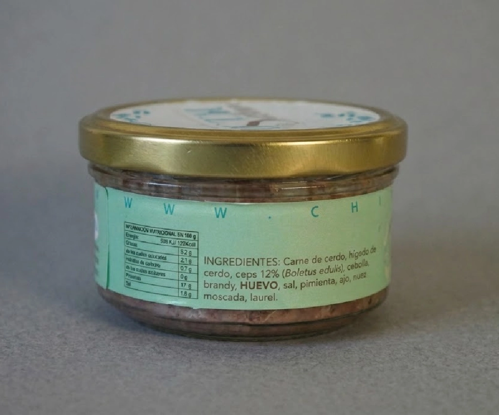 INGREDIENTES: Carne de cerdo, hígado de cerdo, ceps /boletus edulis/ (12%), cebolla, sal, ajo, nuez moscada, laurel, pimienta, brandy, HUEVO.